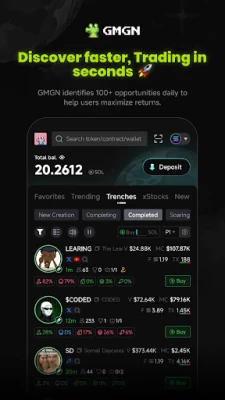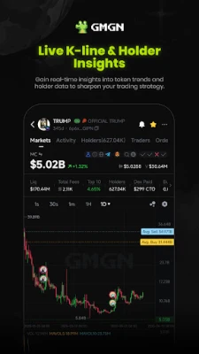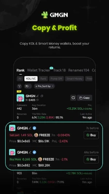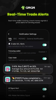 Bincika harkokin "Smart Money" da manyan masu hannun jari (KOLs) tare da GMGN.AI. Manhajar tana bibiyar cinikin su na siye da siyarwa, da kuma shigar da fitar kuɗi, ta yadda za ka fahimci motsin kasuwa daga masu taka rawa. Za ka iya sa ido a kan muhimman walats-walats ɗin da kake so, kuma ka karɓi sanarwa lokacin da suka yi wani ciniki. Kari a kan haka, GMGN yana samar da gargadin haɗari game da honeypots da kuma haraji marasa ka'ida, wanda fasahohin tsaro suka tallafa masa. Haka kuma, za ka samu faɗakarwar farashi lokacin da wasu muhimman matakai suka karye, ko kuma lokacin da sabbin kuɗaɗe ke fitowa da waɗanda ke kan gaba a kasuwa.