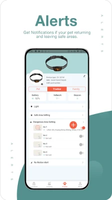 Fasahar bin diddigi kai tsaye tana baka damar gano dabbar ka nan take idan ta ɓace, tana nuna matsayinta a taswira cikin mintuna kalilan. Ko kana fitar da kare don motsa jiki na yau da kullun, ba za ka sake damuwa game da ɓacewa ba, saboda GPS zai yi jagora yayin da Wi-Fi ke ba da goyan baya a matsayin madadin. Kuna iya saita iyakokin wurare (Geo fence) don samun sanarwa lokacin da dabbar ku ta shiga ko ta fita daga wani yanki da aka kayyade, da kuma tsare-tsare don wuraren da ke da haɗari. Za a sanar da kai idan dabbar ka ta kusa da haɗari, yana ba ka damar ɗaukar mataki nan take. Har ila yau, wannan manhaja tana adana tarihin tafiye-tafiye, yana nuna maka inda dabbar ka ta je a matsayin bidiyo mai motsi a taswira.