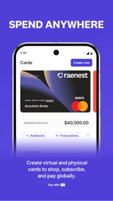 Tare da Raenest, zaku iya buɗe asusun ajiyar duniya (USD, GBP, EUR) a cikin mintuna kaɗan, ba tare da takardu masu wahala ba. Karɓi biya daga sama da ƙasashe 190, gami da abokan ciniki, kasuwanni, iyalai, da masu ɗaukan ma'aikata a duk faɗin duniya. Musanya kuɗaɗe nan take a ainihin farashin kasuwa ba tare da ɓoyayyun kuɗaɗe ba, kuma ku ajiye kuɗin ku cikin kuɗaɗen duniya daban-daban. Bugu da ƙari, Raenest yana ba ku katunan USD na zahiri da na yanar gizo masu aiki ko'ina – daga Google Ads zuwa Meta, Apple, Upwork, AWS, AliExpress, Namecheap, da ƙari. Haka kuma, kuna iya haɗa katin ku zuwa Google Pay don biya ba tare da taɓawa ba, tare da cikakken 'yancin kashewa ba tare da iyakoki ko ƙarin kuɗaɗe ba.