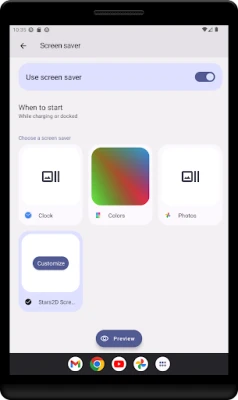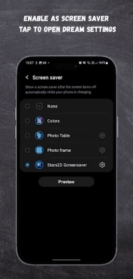 Samun damar shiga saitunan allo mai kashewa na Android ya kasance mai sauƙi. Bayan an fara buɗe aikace-aikacen, zai kai ka kai tsaye zuwa saitunan tsarin inda za ka iya zaɓar "Stars2D" a matsayin mai tsare allonka. Lokacin da kake caji ko kuma an haɗa na'urarka a wurin aiki, wannan fage mai ban sha'awa zai kunna, tare da faɗakarwa ta ƙarshen caji. Ya dace sosai ga masu amfani da suke son kallo mai laushi, mai keɓancewa a kan madubin gefen gado, don nune-nunen, ko kuma duk wanda ke godiya ga ƙira mai ban mamaki yayin da na'urarsu ke samun ƙarfi.